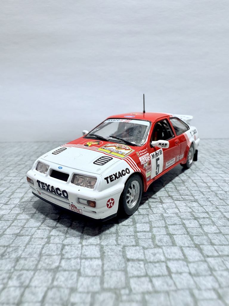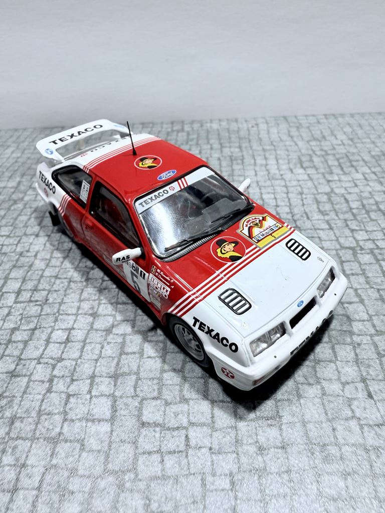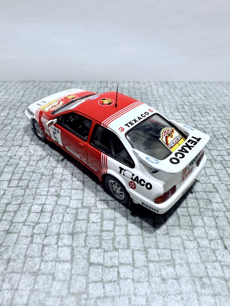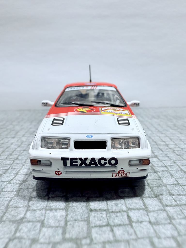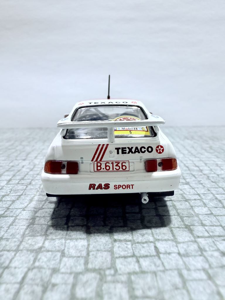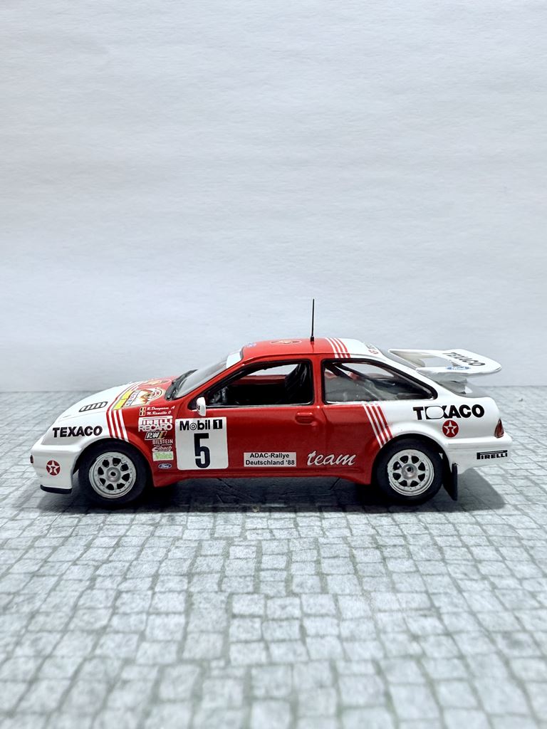 Cosworth RS500 został ogłoszony w lipcu 1987 roku i otrzymał homologację w sierpniu 1987 roku. Główną różnicą w stosunku do trzydrzwiowego Coswortha Sierra był ulepszony silnik wyczynowy Coswortha. W sierpniu 1987 roku Sierra RS500 Cosworth uzyskała homologację. Ford zdobył pole position we wszystkich pozostałych sześciu wyścigach World Touring Car Championship w 1987 roku, a w czterech z nich jako pierwszy przekroczył linię mety. Fabryczny zespół Eggenberger Motorsport wygrał Mistrzostwa Świata w Mistrzostwach Świata, chociaż samochody zespołu zostały zdyskwalifikowane z Bathurst 1000 w Australii w 1987 roku z powodu nieprawidłowości w nadkolach. Były one uznawane za legalne w każdym innym wyścigu w tym roku, jednak to pozbawiło Klausa Ludwiga i Klausa Niedzwiedz tytułu mistrzowskiego kierowców. W 1989 roku Eggenberger wygrał 24-godzinny wyścig w Spa. RS500 odniósł sukces w DTM w 1988 roku, kiedy to Klaus Ludwig w Ford Team Grab zdobył mistrzostwo kierowców, a Wolf Racing zdobył mistrzostwo zespołu. Zarówno Grab, jak i Wolf byli zespołami fabrycznymi Forda i pokonali Mercedesa-AMG oraz BMW M Sport w walce o honory. Sierra Cosworth została również wykorzystana jako samochód rajdowy i odniosła pewien sukces. Po zniesieniu formuły Grupy B w Rajdowych Mistrzostwach Świata pod koniec 1986 roku, producenci musieli zwrócić się ku samochodom Grupy A i Ford, podobnie jak większość innych, znalazł się bez w pełni odpowiedniego samochodu. Cosworth był bardzo mocny, ale z napędem tylko na tylne koła przegrywał z Lanciami i Mazdami z napędem na cztery koła na luźnej nawierzchni, podczas gdy XR4x4 z napędem na cztery koła miał doskonałe podwozie, ale starszy silnik wytwarzający tylko około 230 KM, co najmniej 80 mniej niż Lancia. W sezonie 1987 zespół jeździł na obu modelach, używając XR4x4 na luźnych nawierzchniach i Coswortha na asfalcie, ale wada mocy XR4x4 była zbyt duża i od 1988 roku zespół skoncentrował się na samym Cosworth i kontynuował jego używanie aż do pojawienia się Sierra RS Cosworth 4×4 w 1990 roku. Samochód z napędem na tył nigdy nie wygrał rajdowych mistrzostw świata na luźnej nawierzchni, ale w rękach takich kierowców jak Stig Blomqvist, Carlos Sainz i Ari Vatanen często kończył wyścig w pierwszej piątce, z wyjątkiem sytuacji, gdy warunki były szczególnie śliskie. Na asfalcie był to znacznie poważniejszy rywal, a młody Didier Auriol wygrał Rajd Korsyki w 1988 roku, jedyny raz w tym sezonie, kiedy Lancia została pokonana w prostej walce. Jednak wraz z dalszym rozwojem Lancii Delta Integrale i pojawianiem się nowych samochodów, takich jak Toyota Celica GT-Four ST165, Cosworth stawał się coraz mniej konkurencyjny. Prezentowany model to samochód którym belgijski kierowca Robert Droogmans wygrał 8 edycję rajdu samochodowego ADAC Rallye Deutschland w 1988 roku.