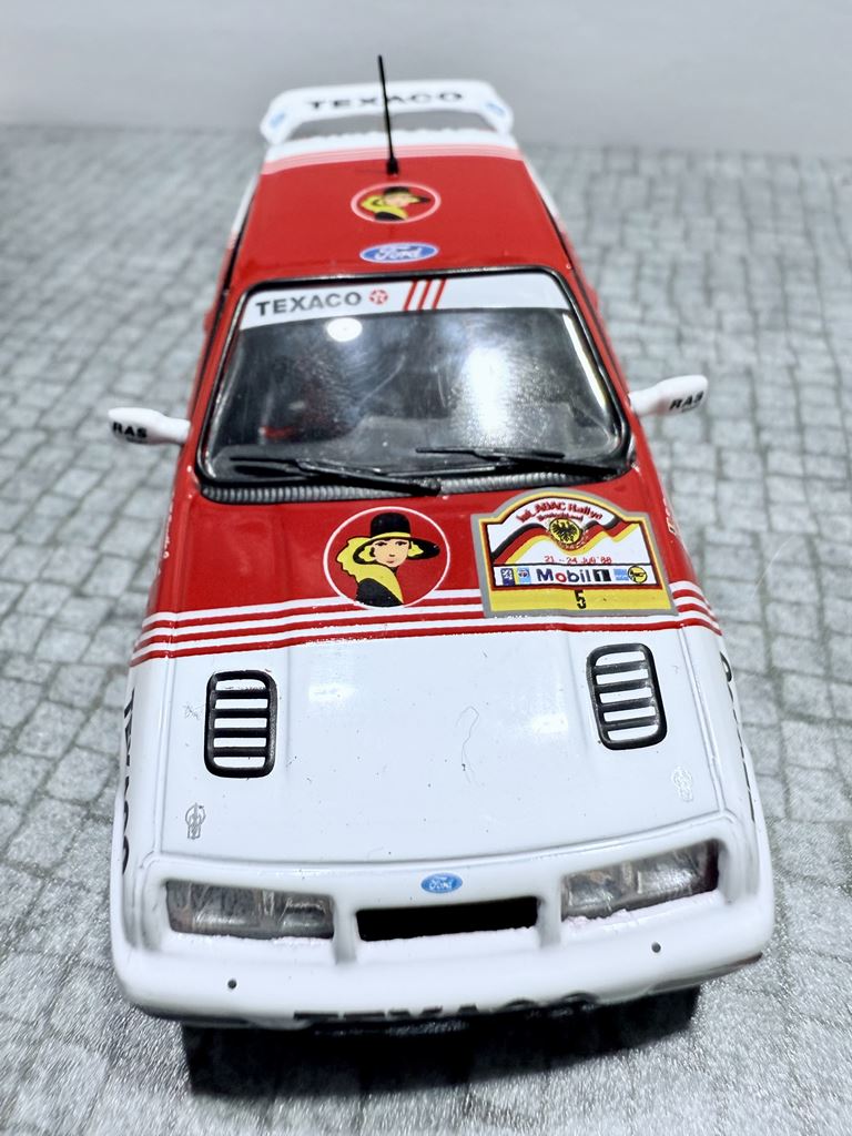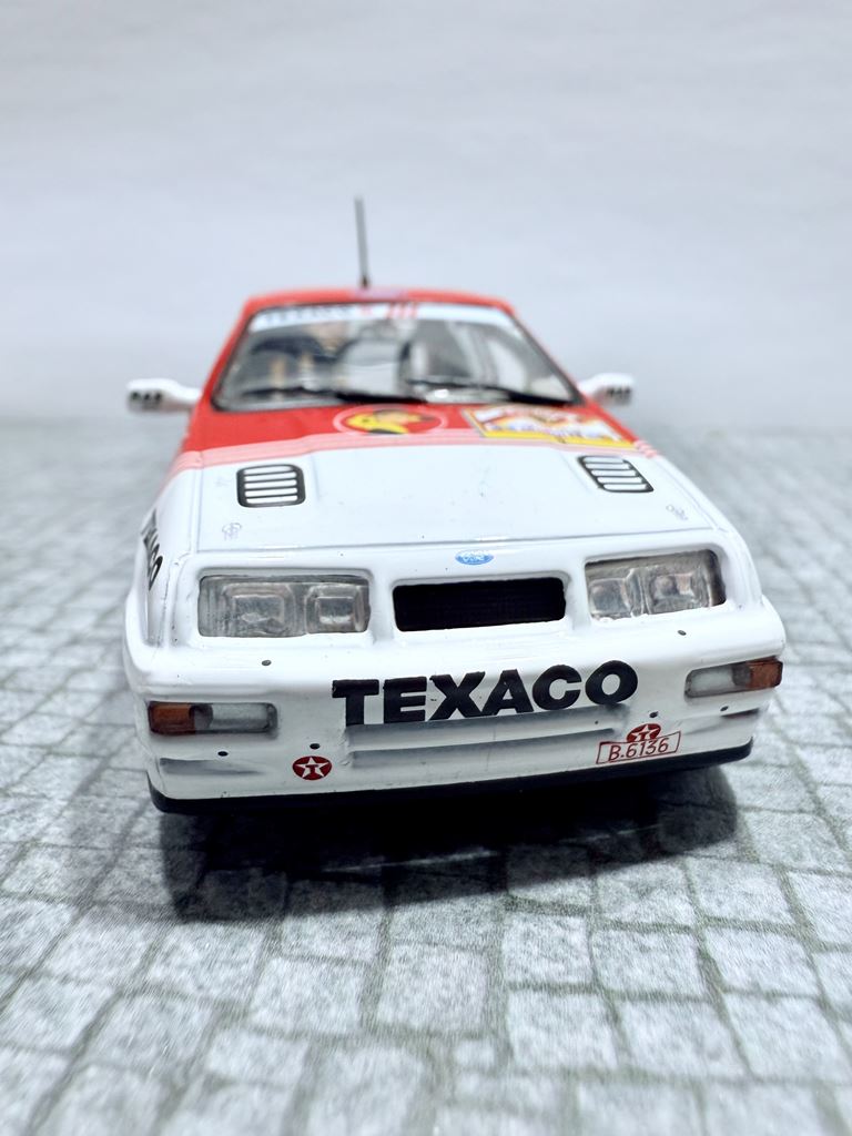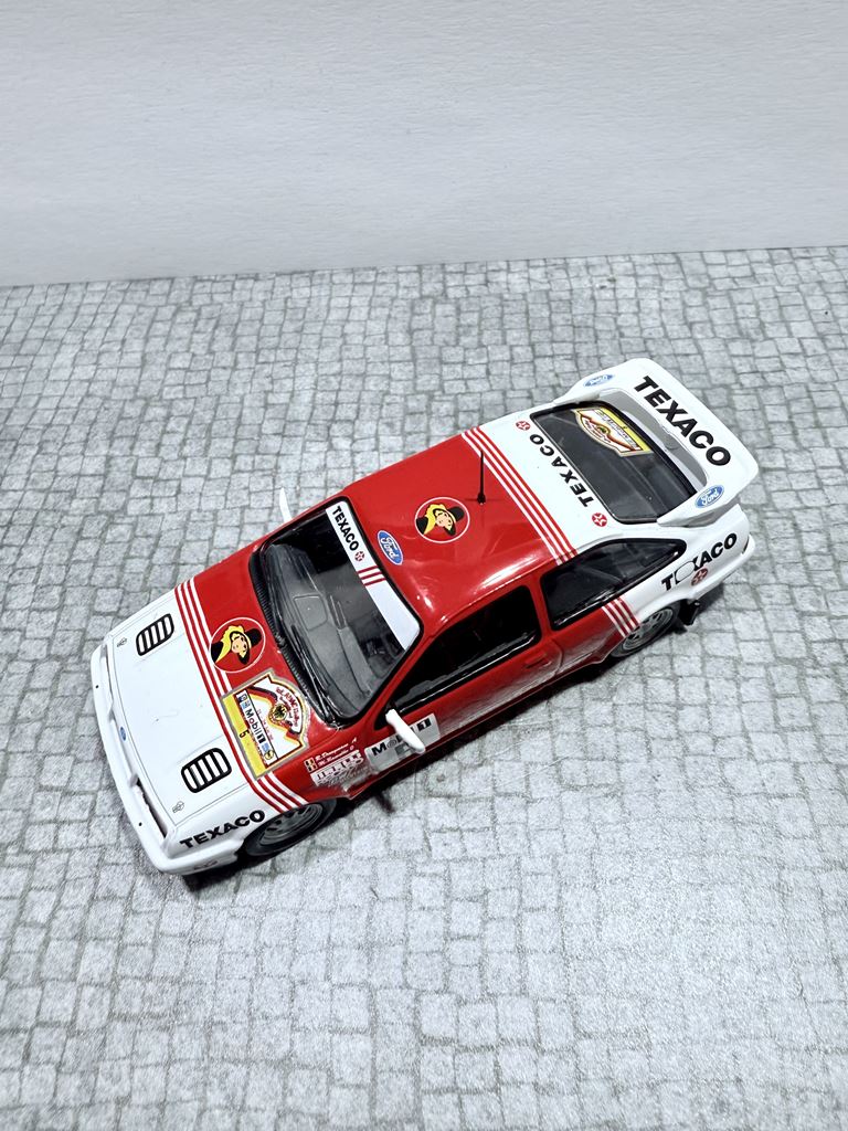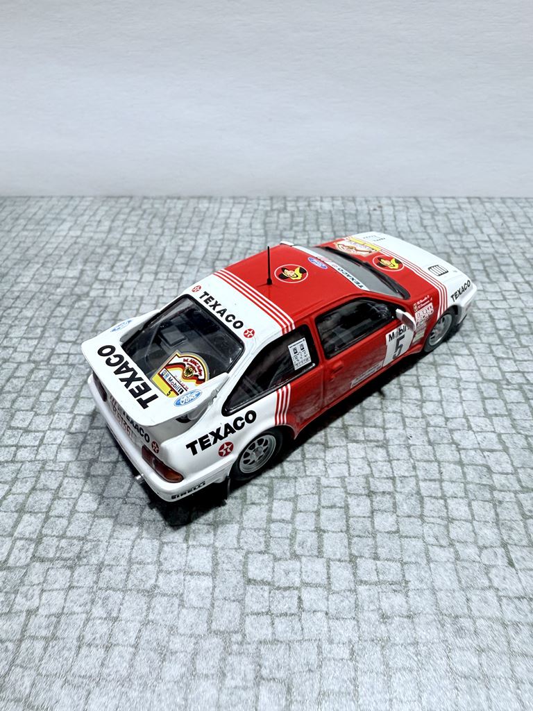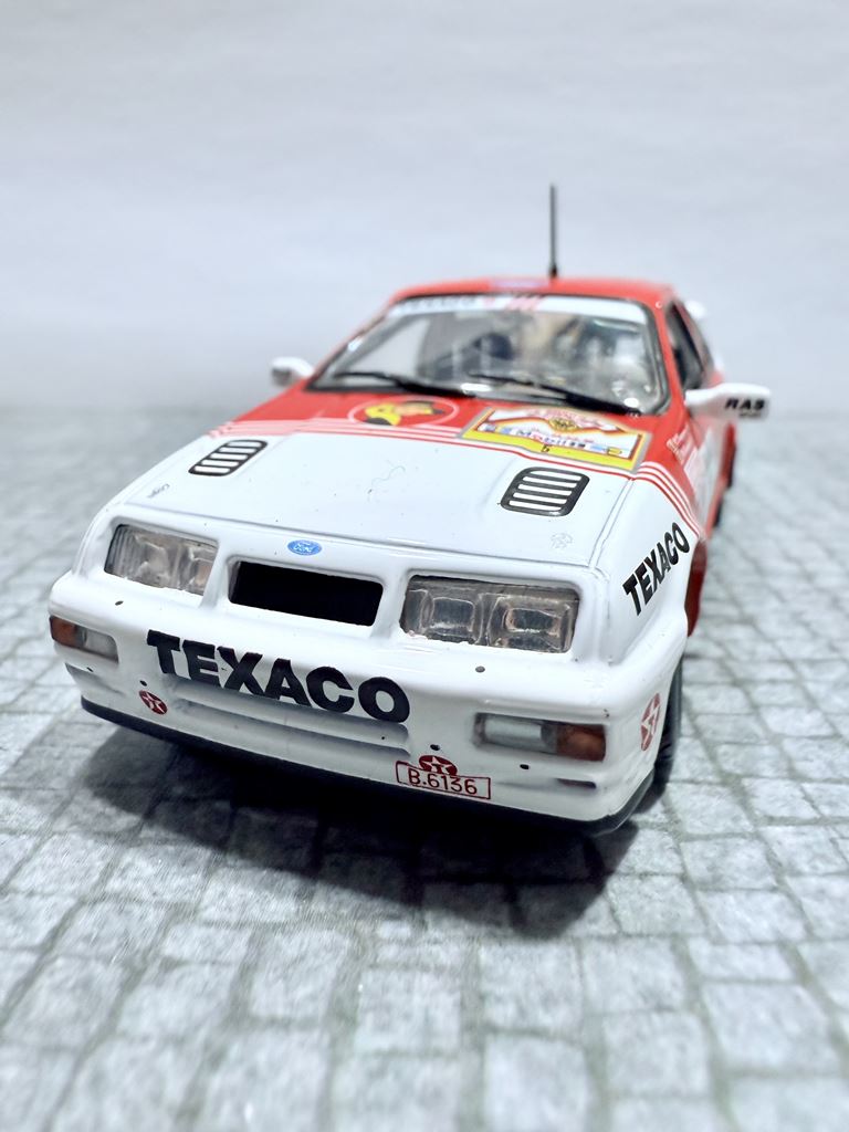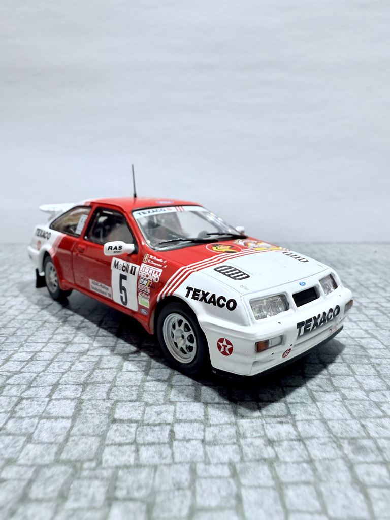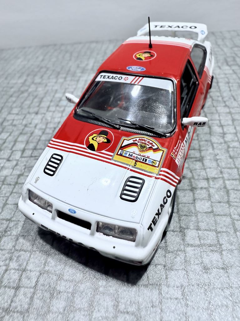 Cosworth RS500 został ogłoszony w lipcu 1987 roku i otrzymał homologację w sierpniu 1987 roku. Główną różnicą w stosunku do trzydrzwiowego Coswortha Sierra był ulepszony silnik wyczynowy Coswortha. W sierpniu 1987 roku Sierra RS500 Cosworth uzyskała homologację. Ford zdobył pole position we wszystkich pozostałych sześciu wyścigach World Touring Car Championship w 1987 roku, a w czterech z nich jako pierwszy przekroczył linię mety. Fabryczny zespół Eggenberger Motorsport wygrał Mistrzostwa Świata w Mistrzostwach Świata, chociaż samochody zespołu zostały zdyskwalifikowane z Bathurst 1000 w Australii w 1987 roku z powodu nieprawidłowości w nadkolach. Były one uznawane za legalne w każdym innym wyścigu w tym roku, jednak to pozbawiło Klausa Ludwiga i Klausa Niedzwiedz tytułu mistrzowskiego kierowców. W 1989 roku Eggenberger wygrał 24-godzinny wyścig w Spa. RS500 odniósł sukces w DTM w 1988 roku, kiedy to Klaus Ludwig w Ford Team Grab zdobył mistrzostwo kierowców, a Wolf Racing zdobył mistrzostwo zespołu. Zarówno Grab, jak i Wolf byli zespołami fabrycznymi Forda i pokonali Mercedesa-AMG oraz BMW M Sport w walce o honory. Sierra Cosworth została również wykorzystana jako samochód rajdowy i odniosła pewien sukces. Po zniesieniu formuły Grupy B w Rajdowych Mistrzostwach Świata pod koniec 1986 roku, producenci musieli zwrócić się ku samochodom Grupy A i Ford, podobnie jak większość innych, znalazł się bez w pełni odpowiedniego samochodu. Cosworth był bardzo mocny, ale z napędem tylko na tylne koła przegrywał z Lanciami i Mazdami z napędem na cztery koła na luźnej nawierzchni, podczas gdy XR4x4 z napędem na cztery koła miał doskonałe podwozie, ale starszy silnik wytwarzający tylko około 230 KM, co najmniej 80 mniej niż Lancia. W sezonie 1987 zespół jeździł na obu modelach, używając XR4x4 na luźnych nawierzchniach i Coswortha na asfalcie, ale wada mocy XR4x4 była zbyt duża i od 1988 roku zespół skoncentrował się na samym Cosworth i kontynuował jego używanie aż do pojawienia się Sierra RS Cosworth 4×4 w 1990 roku. Samochód z napędem na tył nigdy nie wygrał rajdowych mistrzostw świata na luźnej nawierzchni, ale w rękach takich kierowców jak Stig Blomqvist, Carlos Sainz i Ari Vatanen często kończył wyścig w pierwszej piątce, z wyjątkiem sytuacji, gdy warunki były szczególnie śliskie. Na asfalcie był to znacznie poważniejszy rywal, a młody Didier Auriol wygrał Rajd Korsyki w 1988 roku, jedyny raz w tym sezonie, kiedy Lancia została pokonana w prostej walce. Jednak wraz z dalszym rozwojem Lancii Delta Integrale i pojawianiem się nowych samochodów, takich jak Toyota Celica GT-Four ST165, Cosworth stawał się coraz mniej konkurencyjny. Prezentowany model to samochód którym belgijski kierowca Robert Droogmans wygrał 8 edycję rajdu samochodowego ADAC Rallye Deutschland w 1988 roku.