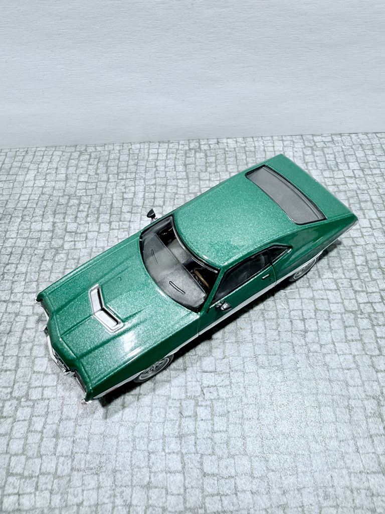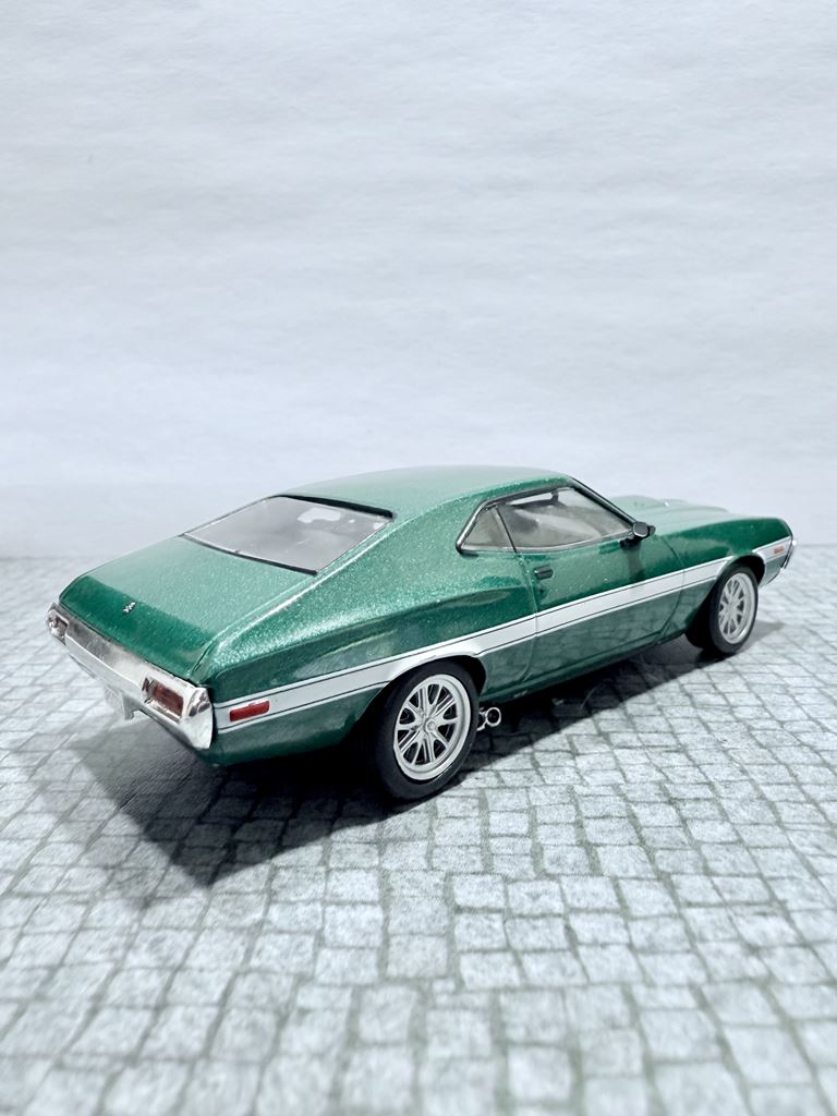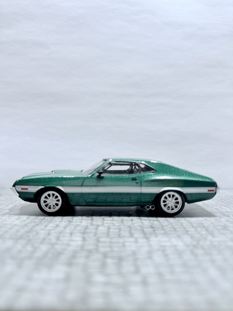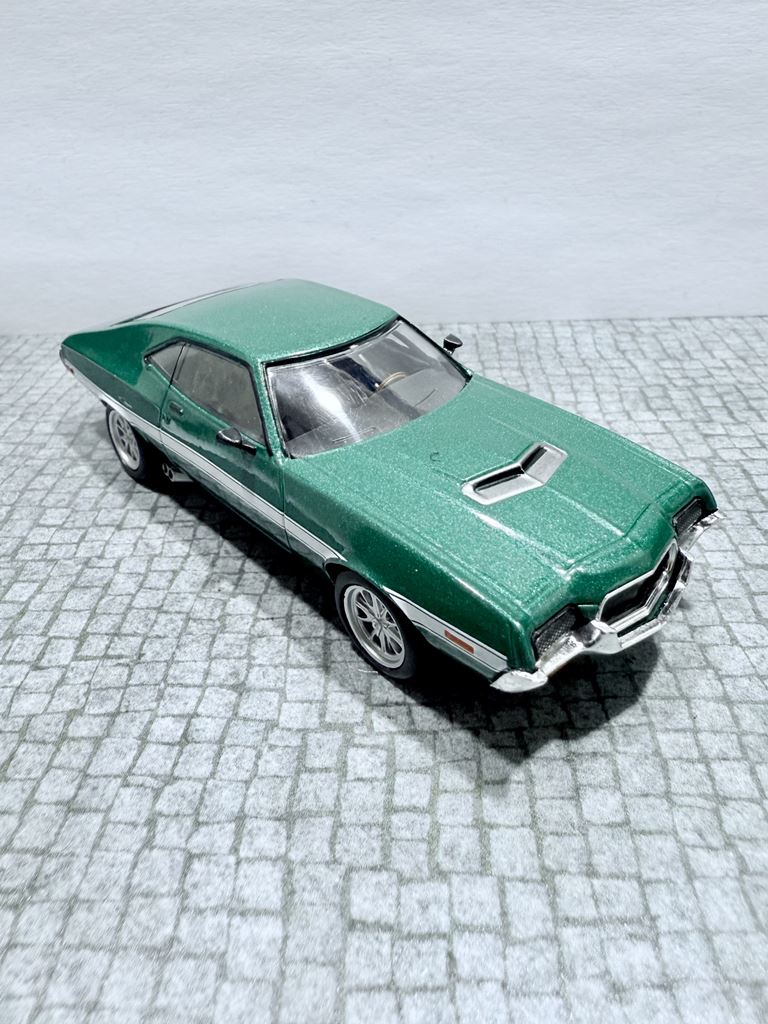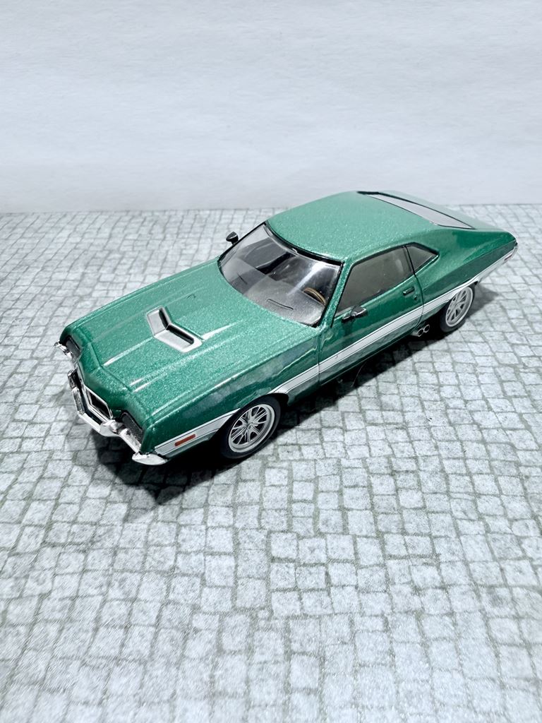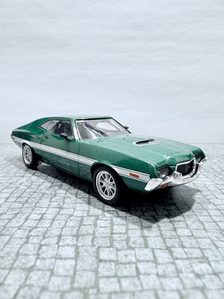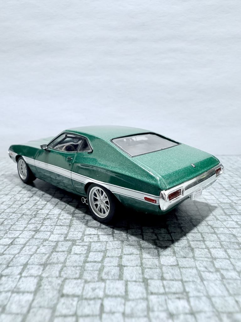 RYS HISTORYCZNY : Ford Torino – samochód osobowy klasy wyższej produkowany pod amerykańską marką Ford w latach 1968–1976. Ford Torino I został zaprezentowany po raz pierwszy w 1968 roku. Nazwa modelu, „Torino,” to po włosku Turyn, najważniejszy ośrodek przemysłu motoryzacyjnego tego kraju będący odpowiednikiem amerykańskiego Detroit. Nazwa ta była także jedną z kilku zaproponowanych dla Forda Mustanga podczas pierwszych faz rozwoju. Ford Torino II został zaprezentowany po raz pierwszy w 1970 roku. Premiera drugiej generacji Forda Torino przyniosła obszerną restylizację wyglądu tego modelu. Zmienił się kształt nadwozia, który zyskał bardziej obłe kształty z dużą liczbą przetłoczeń i strzelistych kształtów. Wyraźnie zaznaczone zostały nadkola, a innym charakterystycznym elementem stała się podłużna maska i nisko poprowadzona linia dachu. Ford Torino III został zaprezentowany po raz pierwszy w 1972 roku. W 1973 sprzedano 496 581 sztuk Torino. Samochód sprzedawał się znacznie lepiej od głównego konkurenta, Chevroleta Chevelle, o ponad 168 000 sztuk. Rok 1974 był udany dla Forda, model Torino nadal był popularny. Wyprodukowano 426 086 sztuk pojazdu, wliczając w to 96 604 Gran Torino Elite.