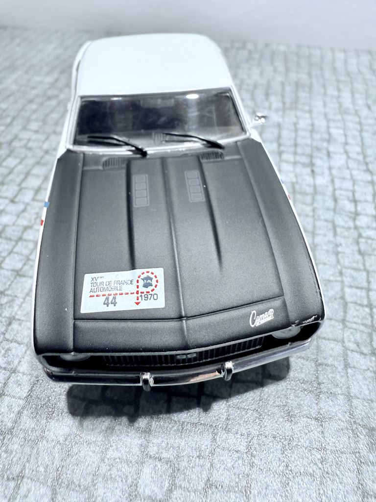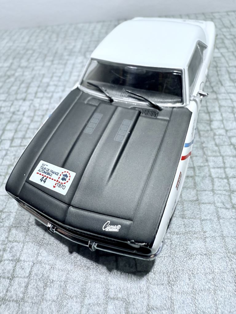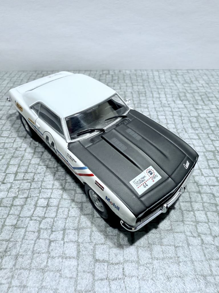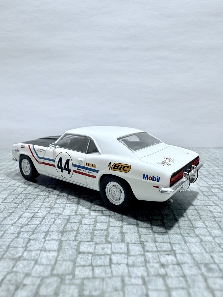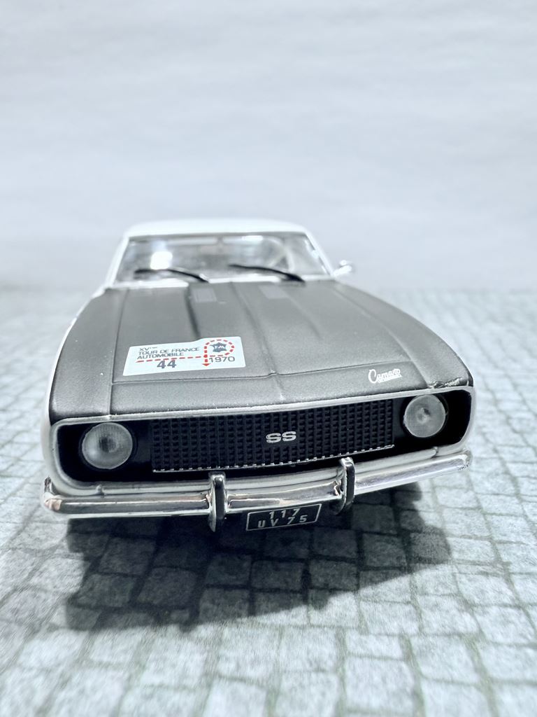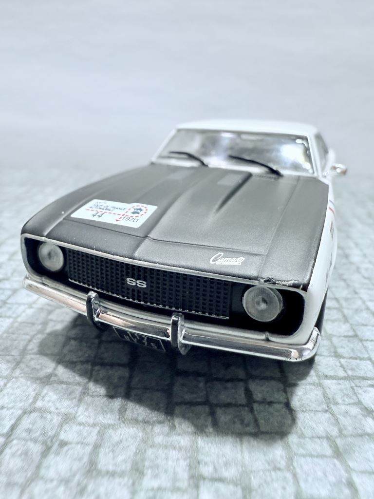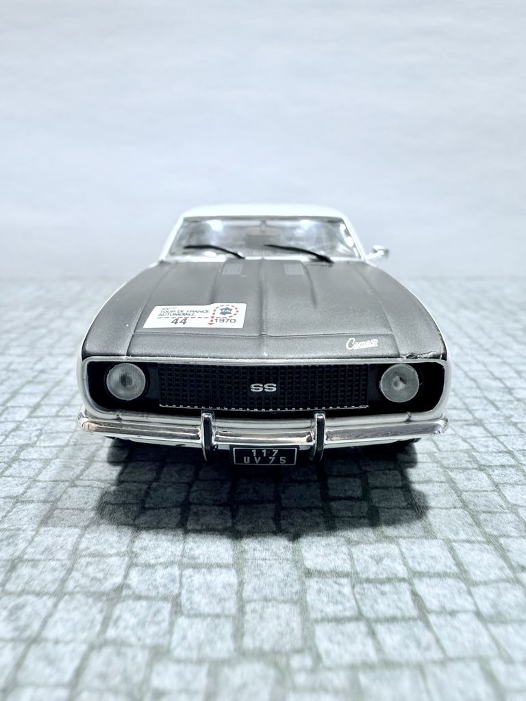 Pierwsza generacja oferowała edycje standardowe, Super Sport i Rally Sport. Zaniepokojeni niekontrolowanym sukcesem Forda Mustanga, kierownictwo Chevroleta zdało sobie sprawę, że sportowa wersja ich kompaktowego Corvaira z silnikiem umieszczonym z tyłu, Monza, nie będzie w stanie wygenerować takiej wielkości sprzedaży jak Mustang z powodu ograniczeń związanych z tym układem (w tym niemożnością współdzielenia całej gamy silników Chevroleta) i spadającej sprzedaży, częściowo z powodu negatywnego rozgłosu związanego z książką Ralpha NaderaNiebezpieczne przy każdej prędkości. Dlatego Camaro było reklamowane ze względu na konwencjonalny napęd na tył, konfigurację silnika z przodu i układ, taki sam jak Mustang. Ponadto Camaro mógł pożyczać części z istniejącego Chevroleta Nova, tak jak robił to Mustang z Forda Falcona. Camaro pierwszej generacji przetrwało do roku modelowego 1969 i ostatecznie zainspirowało projekt nowego Camaro piątej generacji w stylu retro. Camaro było przygotowane jako samochód bezpieczeństwa do wyścigu Indianapolis 500. Podczas trwającej 3 lata produkcji pierwszej generacji Chevroleta Camaro, samochód przeszedł dwie restylizacje, z czego największa przypadła na 1968 rok. W jej ramach zmienił się wygląd pasa przedniego na rzecz pojedynczych reflektorów. Zmieniono też wygląd tylnej części nadwozia, montując dłuższe lampy. Prezentowany model to samochód prowadzony przez Marie-Claude Charmasson, alias Marie-Claude Beaumont która to pracowała jako kierowca rajdowy w zespole Greder Racing od 1969 do 1974 roku. Po końcowym zwycięstwie w Criterium des Cevennes w 1968 roku, Beaumont poczuła, że nadszedł czas, aby przejść do samochodów o większej mocy i prędkości. Henry Greder właśnie założył zespół „Greder Racing” obsługujący samochody General Motors. Marie-Claude, znając zespół, dołączyła do niego. To był trudny start z Oplem w Rajdzie Monte Carlo w 1969 roku, ale w Rajdzie Lyon-Charbonnieres była na dobrej drodze. Opel był dobrym samochodem, ale dlaczego nie spróbować Chevroleta Camaro ? Ten samochód nie jest tak naprawdę „dziewczęcy”, ale Marie-Claude go miała. Po zwycięstwie w Coupe des Dames w Rallye del Ouest, wygrała w klasie Toerism w Course de cote du Minier, a ostateczną eksplozją było zwycięstwo w tej klasie w Tour de France 1969. Wraz z pilotką Martine de la Grandrive ukończyła wyścig na 17. Miejscu w Tour de Corse i w sumie wygrały Rajdowe Mistrzostwa Francji Kobiet w 1969 roku. Powtórzyła to w 1970 roku (również zajęła 4. miejsce w klasyfikacji generalnej) za kierownicą Opla Commodore’a i Kadetta oraz GT, nadal w barwach zespołu Greder.