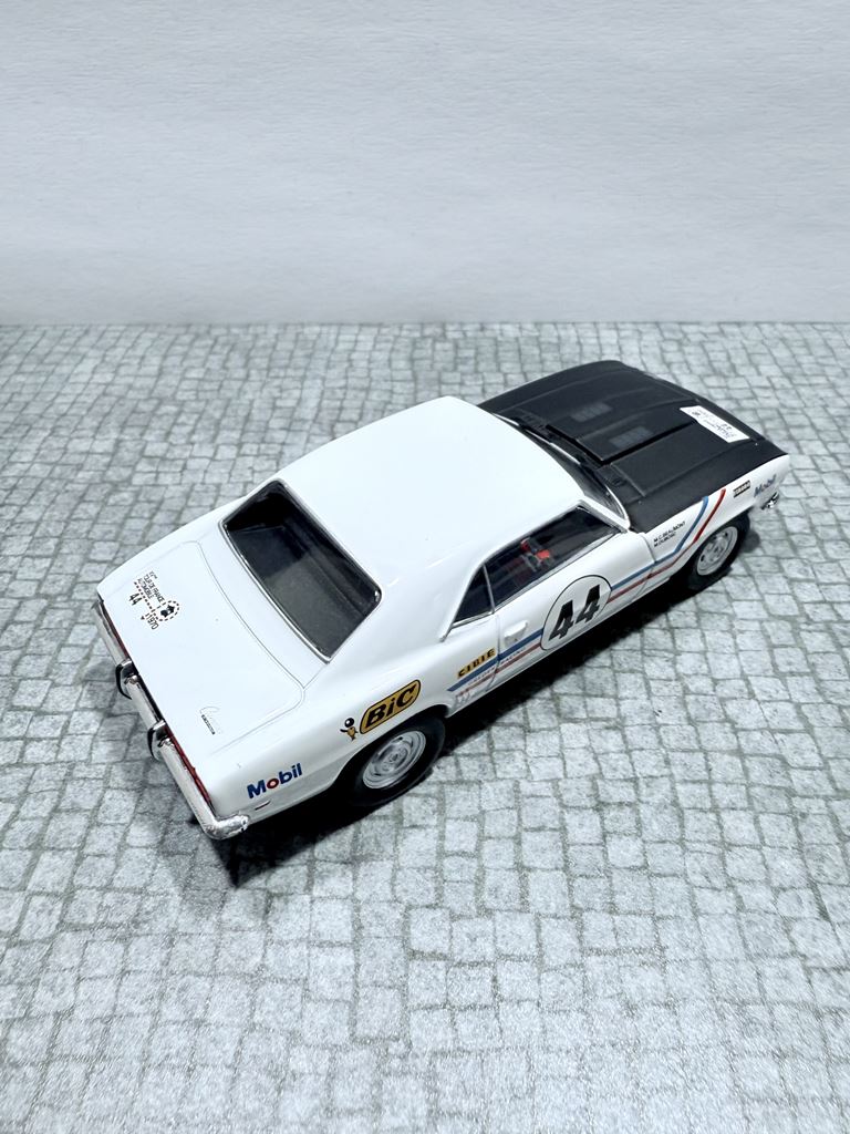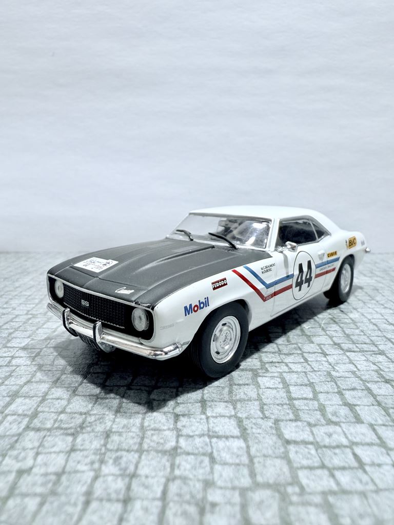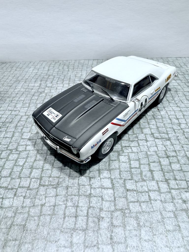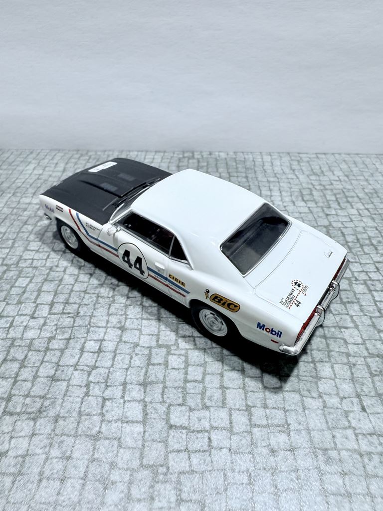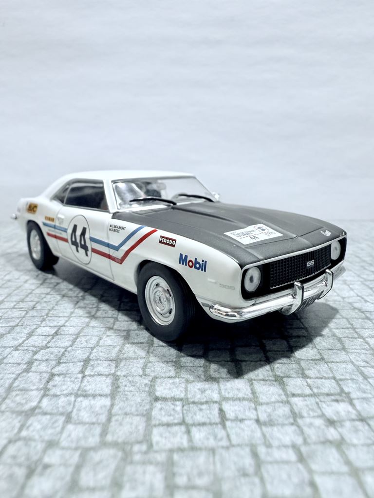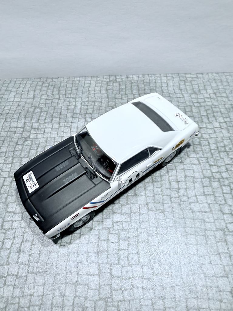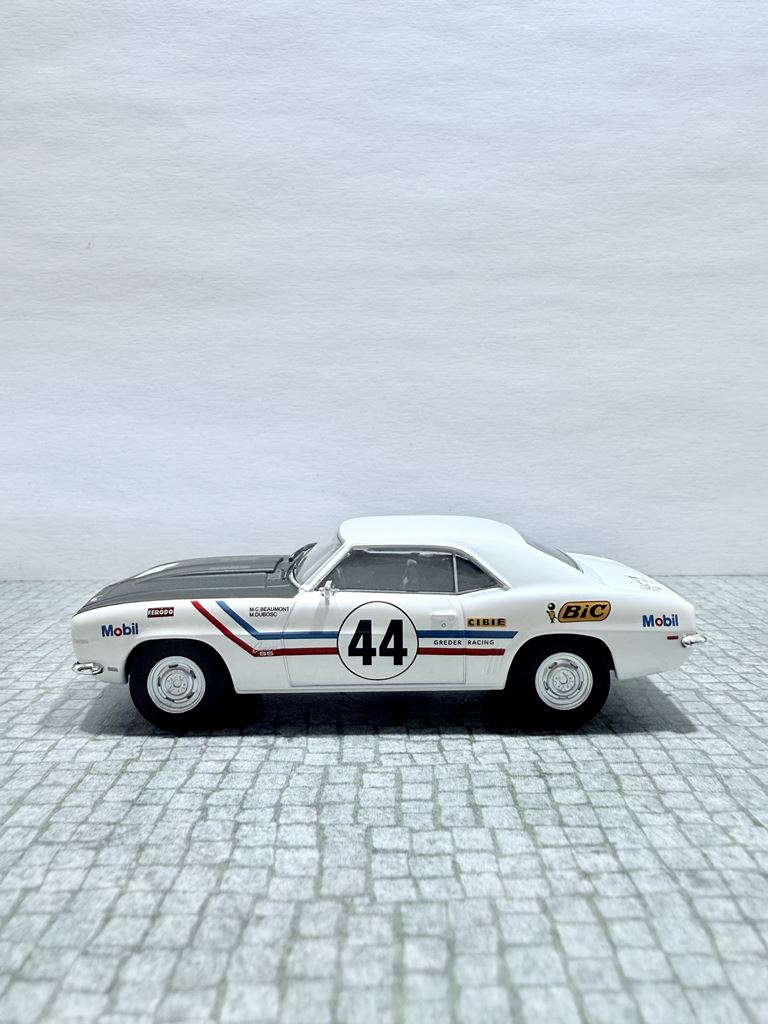 Pierwsza generacja oferowała edycje standardowe, Super Sport i Rally Sport. Zaniepokojeni niekontrolowanym sukcesem Forda Mustanga, kierownictwo Chevroleta zdało sobie sprawę, że sportowa wersja ich kompaktowego Corvaira z silnikiem umieszczonym z tyłu, Monza, nie będzie w stanie wygenerować takiej wielkości sprzedaży jak Mustang z powodu ograniczeń związanych z tym układem (w tym niemożnością współdzielenia całej gamy silników Chevroleta) i spadającej sprzedaży, częściowo z powodu negatywnego rozgłosu związanego z książką Ralpha NaderaNiebezpieczne przy każdej prędkości. Dlatego Camaro było reklamowane ze względu na konwencjonalny napęd na tył, konfigurację silnika z przodu i układ, taki sam jak Mustang. Ponadto Camaro mógł pożyczać części z istniejącego Chevroleta Nova, tak jak robił to Mustang z Forda Falcona. Camaro pierwszej generacji przetrwało do roku modelowego 1969 i ostatecznie zainspirowało projekt nowego Camaro piątej generacji w stylu retro. Camaro było przygotowane jako samochód bezpieczeństwa do wyścigu Indianapolis 500. Podczas trwającej 3 lata produkcji pierwszej generacji Chevroleta Camaro, samochód przeszedł dwie restylizacje, z czego największa przypadła na 1968 rok. W jej ramach zmienił się wygląd pasa przedniego na rzecz pojedynczych reflektorów. Zmieniono też wygląd tylnej części nadwozia, montując dłuższe lampy. Prezentowany model to samochód prowadzony przez Marie-Claude Charmasson, alias Marie-Claude Beaumont która to pracowała jako kierowca rajdowy w zespole Greder Racing od 1969 do 1974 roku. Po końcowym zwycięstwie w Criterium des Cevennes w 1968 roku, Beaumont poczuła, że nadszedł czas, aby przejść do samochodów o większej mocy i prędkości. Henry Greder właśnie założył zespół „Greder Racing” obsługujący samochody General Motors. Marie-Claude, znając zespół, dołączyła do niego. To był trudny start z Oplem w Rajdzie Monte Carlo w 1969 roku, ale w Rajdzie Lyon-Charbonnieres była na dobrej drodze. Opel był dobrym samochodem, ale dlaczego nie spróbować Chevroleta Camaro ? Ten samochód nie jest tak naprawdę „dziewczęcy”, ale Marie-Claude go miała. Po zwycięstwie w Coupe des Dames w Rallye del Ouest, wygrała w klasie Toerism w Course de cote du Minier, a ostateczną eksplozją było zwycięstwo w tej klasie w Tour de France 1969. Wraz z pilotką Martine de la Grandrive ukończyła wyścig na 17. Miejscu w Tour de Corse i w sumie wygrały Rajdowe Mistrzostwa Francji Kobiet w 1969 roku. Powtórzyła to w 1970 roku (również zajęła 4. miejsce w klasyfikacji generalnej) za kierownicą Opla Commodore’a i Kadetta oraz GT, nadal w barwach zespołu Greder.