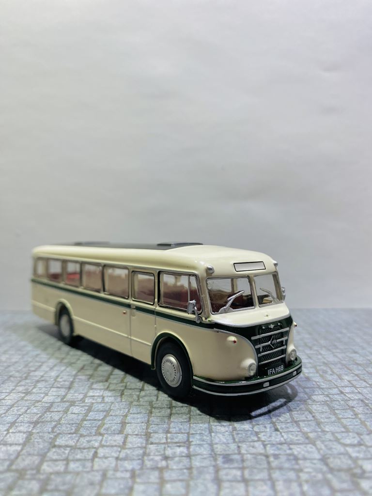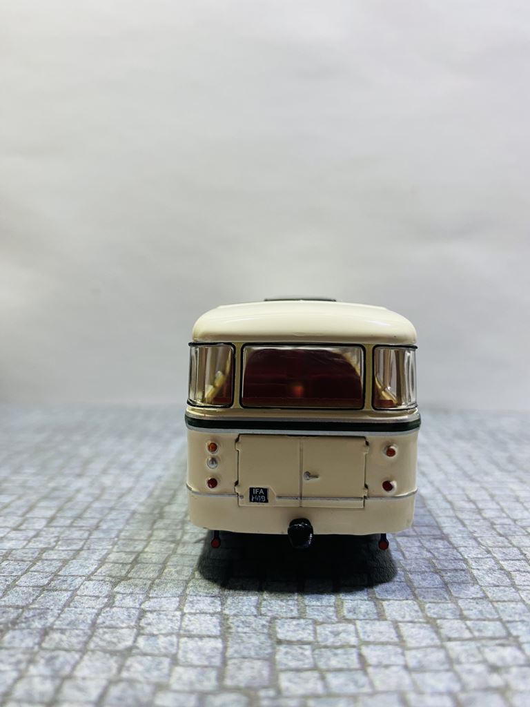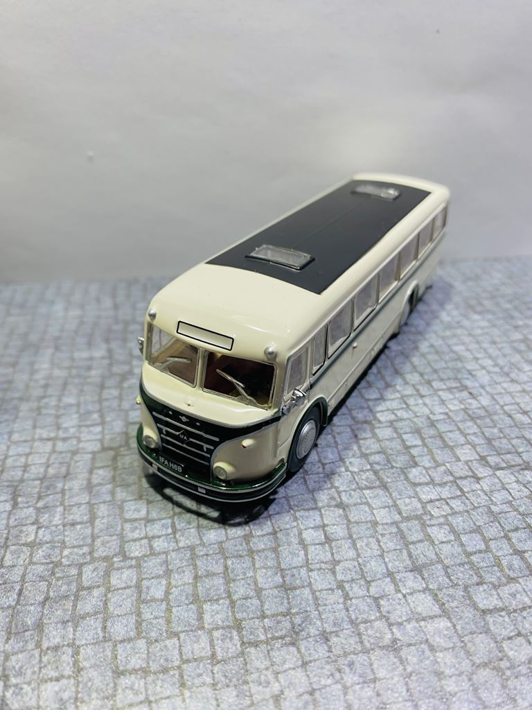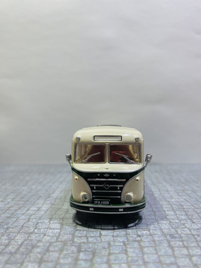 Podstawą rozwoju autobusu była produkcja zunifikowanych ciężarówek typu H6, których jednostka napędowa i części podwozia nadawały się również do budowy autobusów. Autobusy zostały oznaczone jako H6B ze względu na identyczną bazę konstrukcyjną z wagonem H6. H oznaczało silnik Horch, numer 6 ładowność samochodu w tonach, a B niemieckie słowo oznaczające autobus. Autobusy IFA H6B wyróżniały się dużą niezawodnością i aż do lat siedemdziesiątych XX wieku z natury należały do krajobrazu NRD. IFA H6B był jednym z najbardziej typowych autobusów wschodnioniemieckich dróg drugiej połowy XX wieku. Był to pojazd dwuosiowy z półsamonośnym nadwoziem typu trambus. Sztywne osie były zawieszone na resorach piórowych. Układ kierowniczy był bez zasilania. Wsiadanie do pojazdu odbywało się przez jedne lub dwoje drzwi, w zależności od konstrukcji. W wersji H6B/S drzwi były sterowane pneumatycznie, w wersji H6B/L drzwi. Dodatkowo kierowca miał własne drzwi w lewej ścianie bocznej, które prowadziły bezpośrednio do jego stanowiska, ponieważ silnik znajdował się nad przednią osią i sięgał daleko w głąb wnętrza pojazdu. W dolnej części nadwozia między przednią i tylną osią znajdował się bagażnik. Wewnątrz autobusu znajdowało się sześć rzędów siedzeń dla 32 (34) pasażerów. Miejska wersja H6B/S (wersja berlińska) miała pojemność 26 pasażerów siedzących i 34 stojących. Standardowe wyposażenie wersji H6B/L obejmowało fotele ze sztucznej skóry z uchwytami bezpieczeństwa. Wnętrze wyłożono drewnem, a wentylację zapewniały dwie klapy dachowe. W przypadku dłuższych dalekich podróży w oknach były zasłony. Obie wersje H6B/S i H6B/L przystosowano do ciągnięcia przyczep autobusowych (HW80 i W701). Moc była przenoszona z silnika za pośrednictwem jednotarczowego suchego sprzęgła, pięciobiegowej manualnej skrzyni biegów i przegubu na tylną oś. Osie zostały wyposażone w koła tarczowe wykonane z blachy stalowej. Przestrzeń dla orientacji linii na przedniej powierzchni miała kształt kanciasty. Prezentowany model to wersja H6B/L – autobus międzymiastowy („L” Linienbus) – z przednimi i tylnymi drzwiami zatrzaskowymi. Do czasu spopularyzowania Ikarusów, był to jeden z podstawowych środków transportu na terenie NRD. Autobus produkowało się zarówno w wersjach miejskich, jak i turystycznych, a wiele egzemplarzy doczekało nawet zjednoczenia Niemiec. Po zakończeniu ich aktywnej eksploatacji w regularnej komunikacji, wiele pojazdów zostało przekazanych prywatnym firmom autobusowym lub rolniczym spółdzielniom produkcyjnym, gdzie służyły nawet końca NRD.