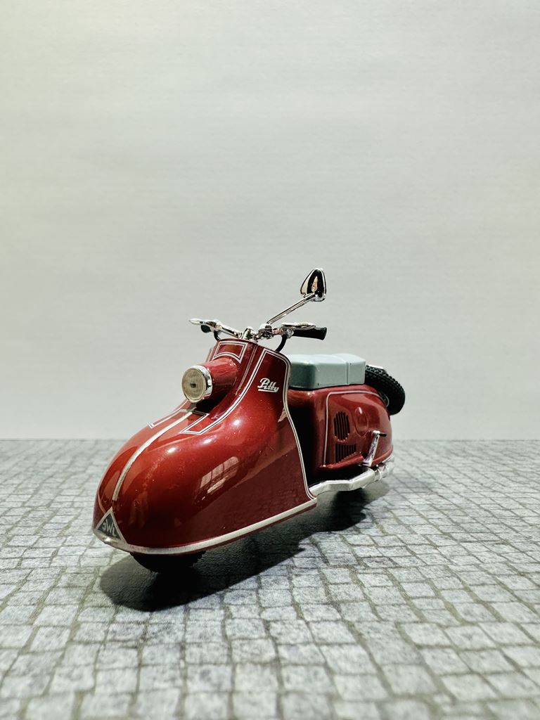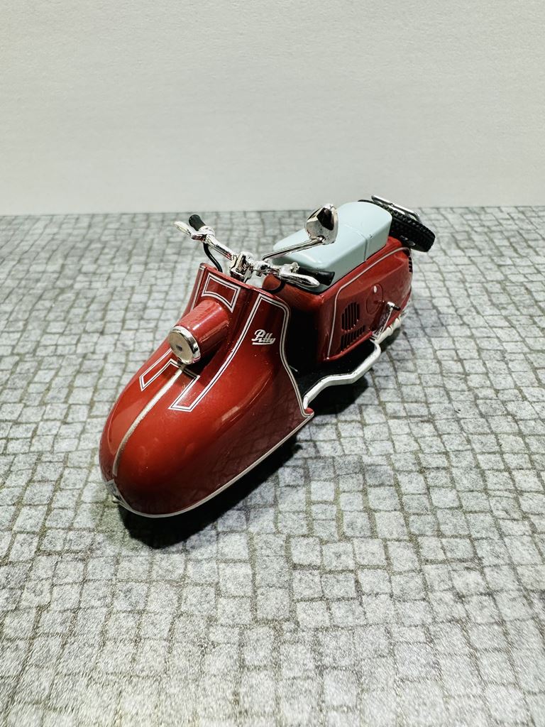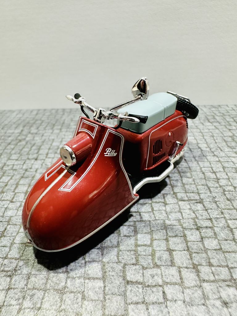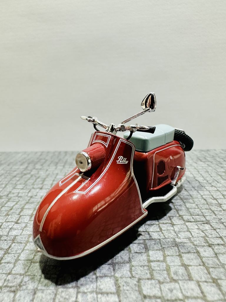 RYS HISTORYCZNY Pitty to model skutera, który został wyprodukowany w NRD. Został zbudowany od lutego 1955 do kwietnia 1956 roku jako pierwszy skuter w VEB Industriewerke Ludwigsfelde. Dwumiejscowy skuter ma chłodzony wentylatorem silnik o pojemności 125 cm³. Prędkość maksymalna wynosi 65 km/h. Jego następcą jest model Wiesela. Na początku 1950 roku nastąpił pierwszy boom na skutery, który rozpoczął się od udanych modeli Piaggio. Po tym, jak niektórzy producenci w Republice Federalnej Niemiec dołączyli do tego trendu, popyt na skuter stał się głośny również w NRD. Jednak w gospodarce sterowanej centralnie początkowo trudno było wybrać odpowiedni projekt do produkcji seryjnej. Już w 1950 roku mistrz rzemieślniczy August Falz był zaangażowany w budowę skuterów testowych, które nazwał Falzo. Jego skutery miały ciekawe detale konstrukcyjne, takie jak dźwignia ręczna do uruchamiania silnika zamiast kickstartera. Jeden z jego typów Falzo został zaprezentowany na targach w Lipsku i prawdopodobnie był również produkowany na mniejszą skalę. Nie wiadomo, dlaczego nie doszło do produkcji na dużą skalę. Preferowano projektanta Maxa Freihoffa, który był zwolennikiem kierownictwa państwa jako założyciel pierwszego PGH handlu metalami. Jednak planowana seryjna produkcja jego skutera Hexe nie powiodła się z powodu wad koncepcyjnych, takich jak przegubowe zawieszenie, konstrukcja, która była wygodna, ale pozwalała skuterowi wyginać się w środku pod obciążeniem. W rezultacie zebrano grupę inżynierów i wykwalifikowanych pracowników, aby zaprezentować pojazd testowy w ciągu 81 dni. Rezultatem był Pitty pod koniec 1953 roku. Produkcja seryjna zapowiedziana na lato 1954 roku została opóźniona do lutego 1955 roku. W międzyczasie August Falz budował już nowoczesny skuter Sibylle, ale nawet ten zaawansowany projekt nie został przeniesiony do produkcji seryjnej. Pitty został po raz pierwszy pokazany na targach w Lipsku wiosną 1955 roku.
