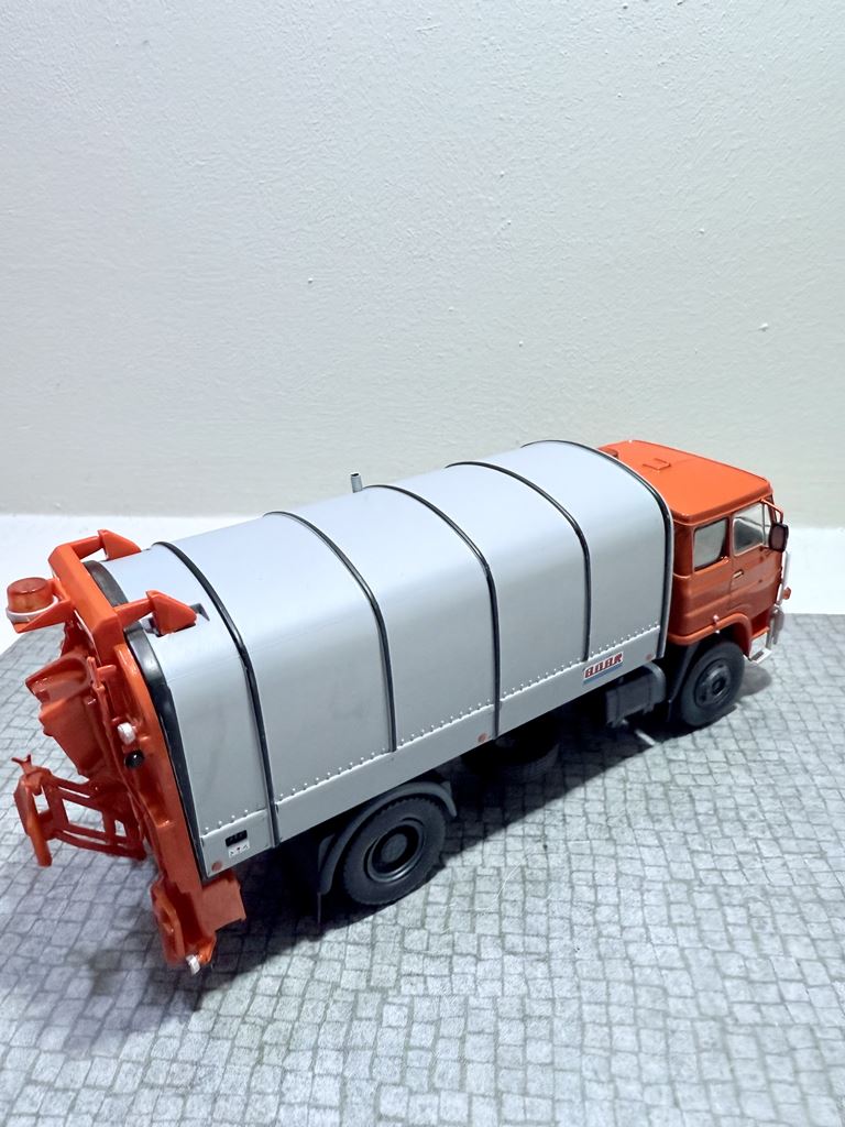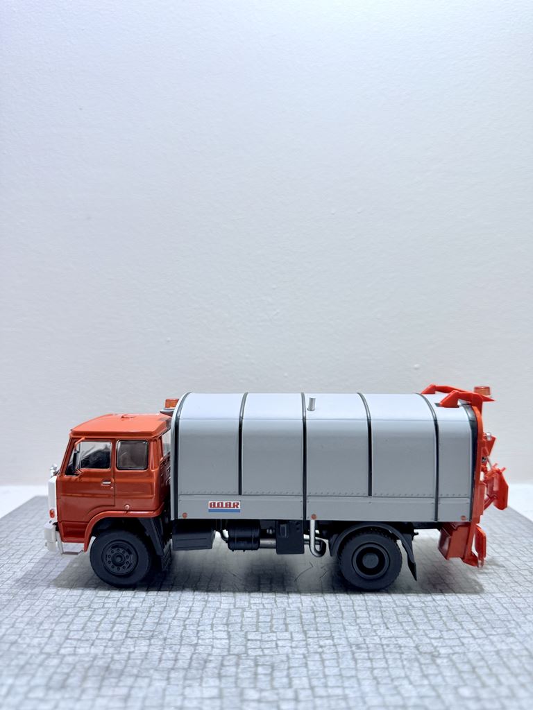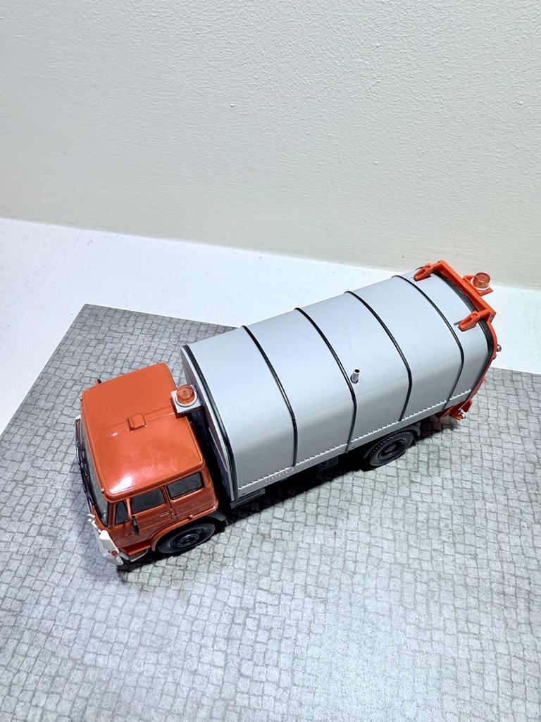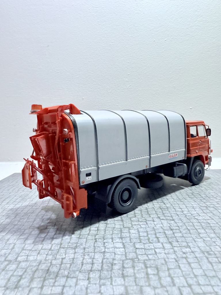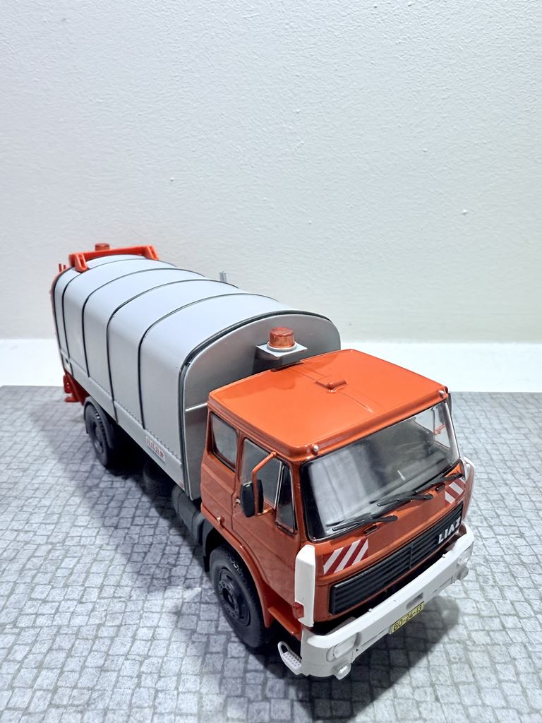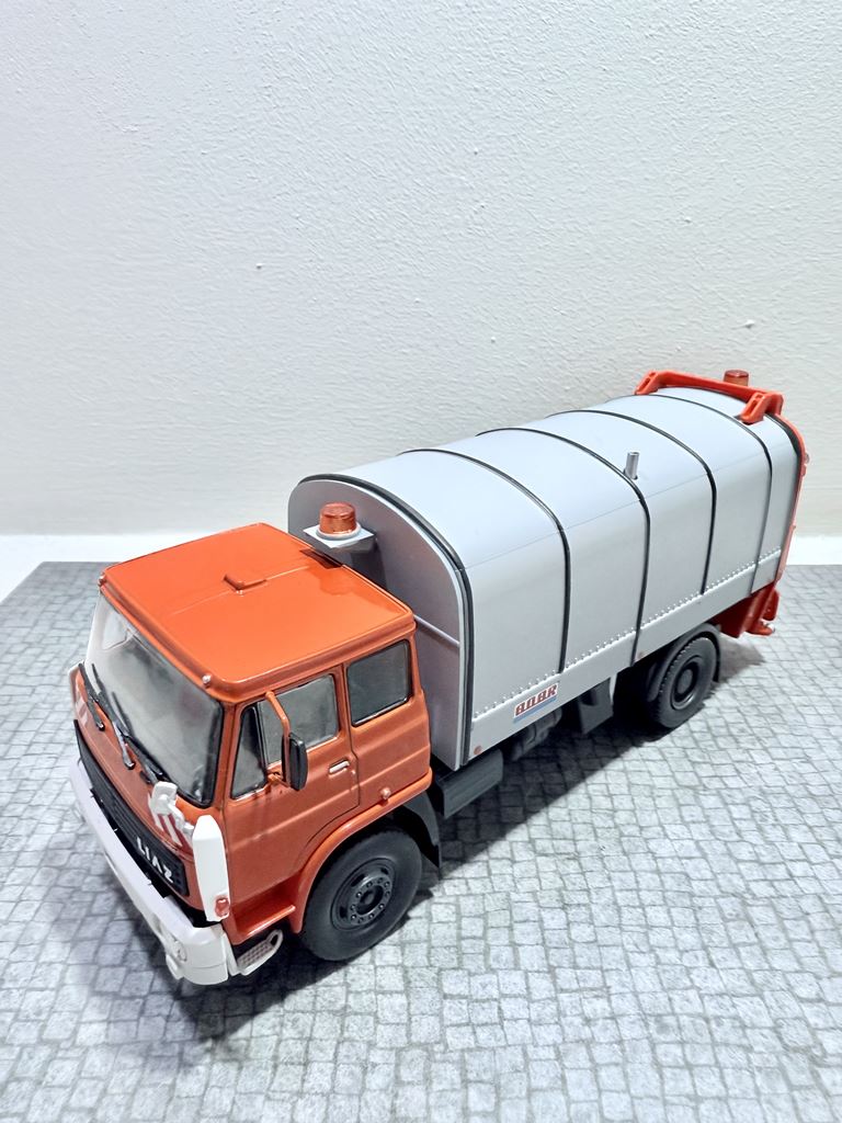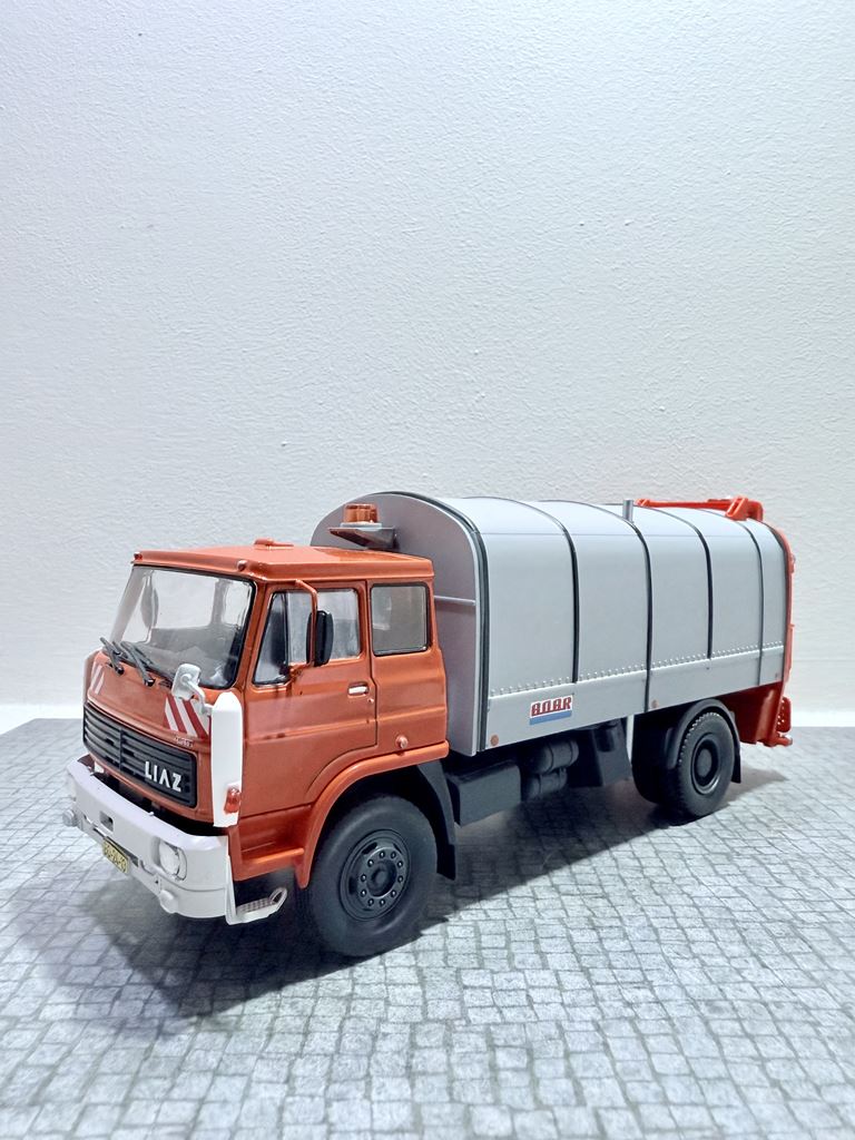 Produkcję seryjną poprzedziło powstanie wielu prototypów i samochodów przed seryjnych, w tym prototyp ciągnika 100.51/1 z zawieszeniem pneumatycznym wyprodukowany w marcu 1971 roku. W 1974 roku powstała seria ciągników 100,45 po dziesięć sztuk. Była to raczej seria testowa, na której dopracowywano technologię montażu i produkcji. Pojazdy te były do pewnego stopnia identyczne z innymi pojazdami seryjnymi. Główna różnica dotyczyła głównie kabiny, której wysokość została podniesiona o 80 mm w pojazdach późniejszych produkcji ze względu na międzynarodowe przepisy dotyczące bezpieczeństwa załogi. Pierwszy prototyp ciężarówki z platformą 100.05 został wyprodukowany w 1970 r., w 1975 r. powstała dziesięcioczęściowa seria testowa ciężarówek z platformą 100.05, a w 1976 r. kolejna seria 14 sztuk. Produkcja seryjna odbywała się wówczas w zakładzie LIAZ 06 w Zwoleniu. W 1977 roku w pełni uruchomiono seryjną produkcję ciągników LIAZ 100.47 i ciężarówek z platformą LIAZ 100.05 (już z wyższym sufitem kabiny) w transporcie krajowym, a zwłaszcza międzynarodowym (seria MT nie spełniała już przepisów bezpieczeństwa EWG). Bardzo powoli i w znacznie mniejszych ilościach na rynek wchodziły inne warianty, zwłaszcza specjalnie skonstruowane podwozie LIAZ 100.08 itp. Wszystkie modele wyposażono w „średnią” dwu- lub trzymiejscową kabinę bez wywrotu, ale dopiero w 1984 roku zaczęto produkować samochody ze zmodernizowaną składaną kabiną w wersji średniej (typy 110.xxx i 111.xxx) lub krótkiej (typy 150.xxx lub 151.xxx), a także zaczęto stosować zawieszenie mechaniczno-pneumatyczne przedniej i tylnej osi, zwłaszcza w ciągnikach. Do produkcji małoseryjnej wszedł również typ 122.xxx z osią 6×2 do zabudów. Dalsze ulepszenia serii 100 wprowadzono po 1989 roku, kiedy konkurencja wzrosła wraz z otwarciem rynku. Gama obejmowała nową 16-biegową skrzynię biegów ZF, kabinę dalekobieżną MAXI z wysokim dachem, układ hamulcowy ABS, centralne smarowanie, elektryczne lusterka i szyby, lodówkę i fotele ISRI. Prezentowany model to śmieciarka Bobr zamontowana na podwoziu LIAZ 110.820 która została wyposażona w system opróżniania 110 litrowych okrągłych pojemników na śmieci. Owe kosze były popularne również w Polsce. Nazwa Bobr nie pochodzi bynajmniej od zwierzęcia ale to zbitka powstała od dwóch miast w których budowano samochód : Stara BOleslav i BRandys nad Labem . Pojazd posiadał kontener zbiorczy z wewnętrznym systemem ugniatania odpadów o pojemności 12m3 . Maksymalna waga nieczystości mogła wynosić około 6 ton.