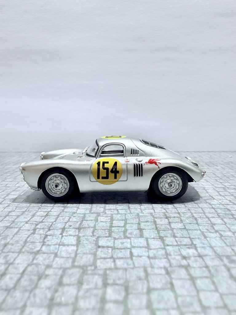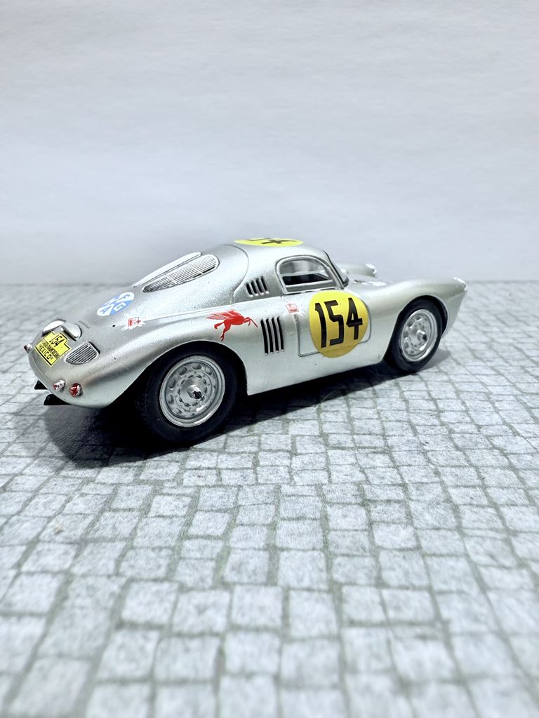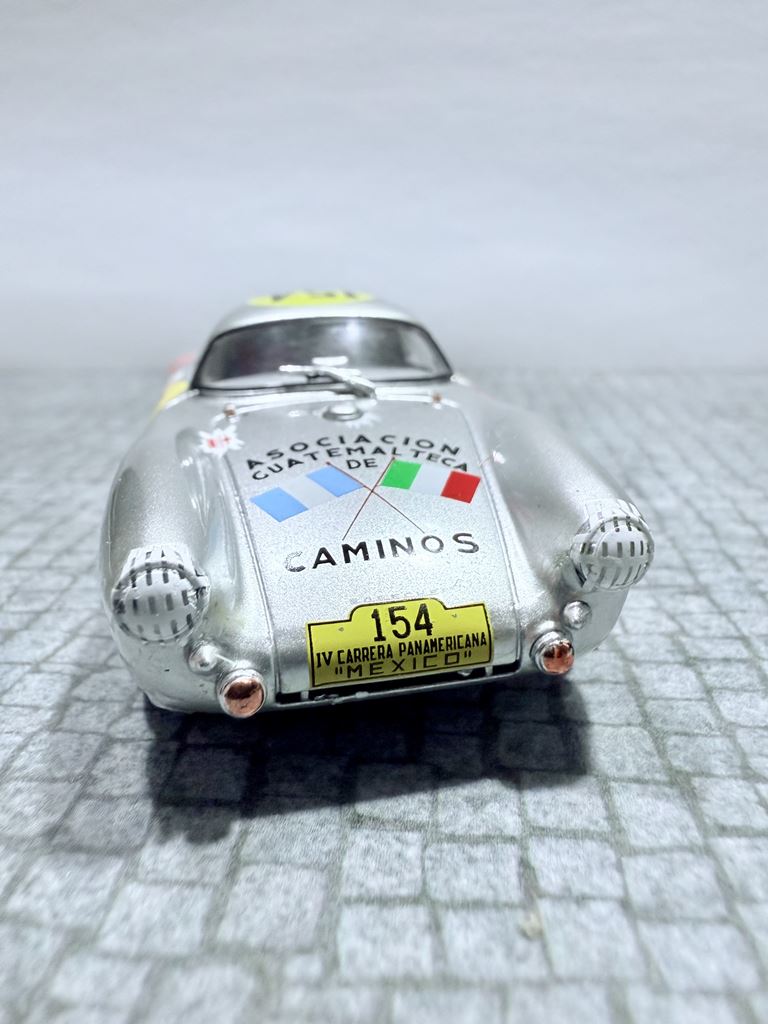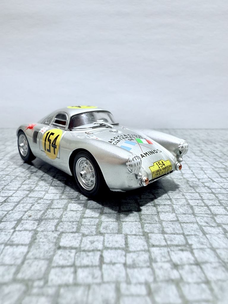 RYS HISTORYCZNY : Porsche 550 – samochód sportowy produkowany przez Porsche w latach 1953–1957. W oparciu o model Porsche 356, który został zaprojektowany przez Ferry’ego Porsche, i prototypy Roadster testowane przez Waltera Glöcklera od 1951, fabryka zdecydowała się zbudować samochód, który będzie skonstruowany specjalnie do wyścigów. Model 550 Spyder został zaprezentowany podczas Paris Auto Show w 1953 roku. Wyraźnie obniżona konstrukcja miała na celu zwiększenie wydajności podczas wyścigów. To właśnie tym modelem Hans Herrmann, były niemiecki kierowca Formuły 1 przejechał w ostatnich sekundach pod zamkniętym szlabanem przed pędzącym pociągiem w Mille Miglia w 1954.